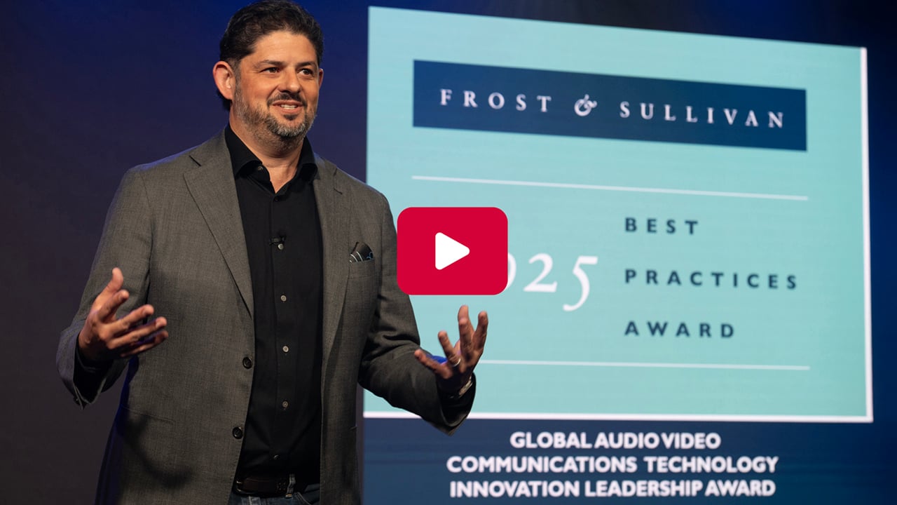 Jason Moss, SVP, Marketing & Ecosystem for Q-SYS, introduces Roopam Jain from Frost & Sullivan, who delivers the good news around its 2025 Frost & Sullivan Technology Innovation Leadership Recognition. QSC was recognized for Global Audio Video Communications Industry Excellence in Best Practices.