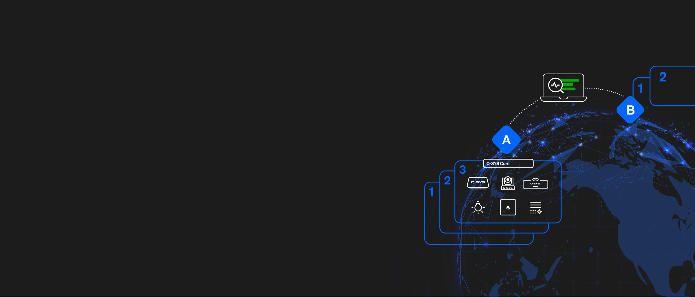 • Gain real-time visibility and insights into Q-SYS and third party AV system performance, status, trends, inventory and more.