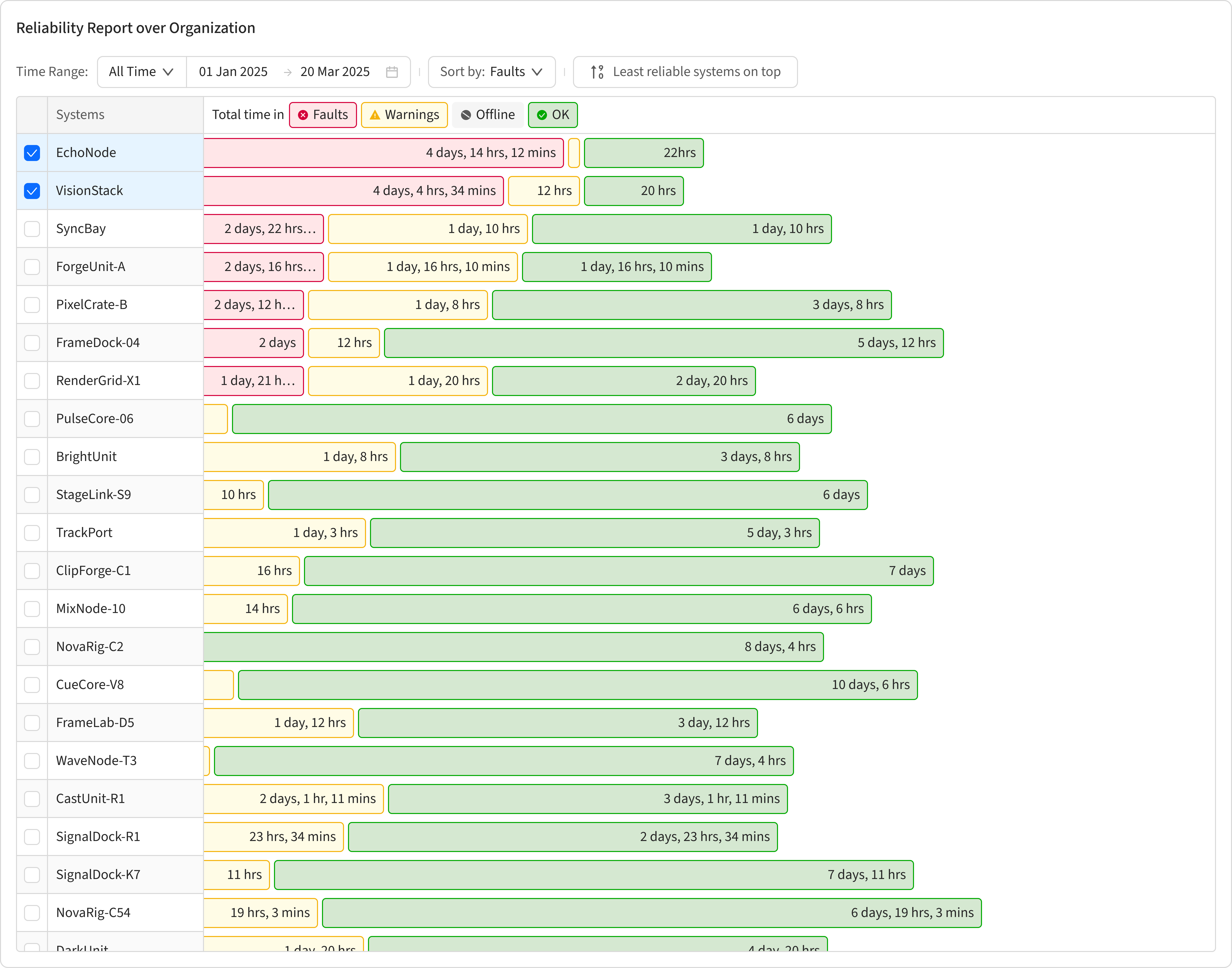 Track system status over time, see your most and least reliable systems, and view and export reliability reports.