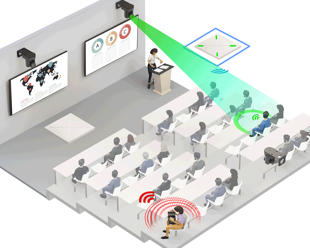 Through Speaker Spotlight technology the active speaker’s voice drives camera framing without the need for presets, while voice activity detection protects against false audio triggers. With Presenter Spotlight technology advanced computer vision drives full-body presenter tracking.